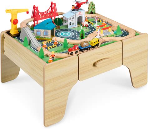 Train Table 3-In-1 Wooden Train Set Table W/Reversible 84 PCS Track Train Toys Table Map And Storage