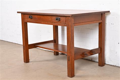 Antique Arts & Crafts Mission Oak Two Drawer Library Table By Gustav Stickley
